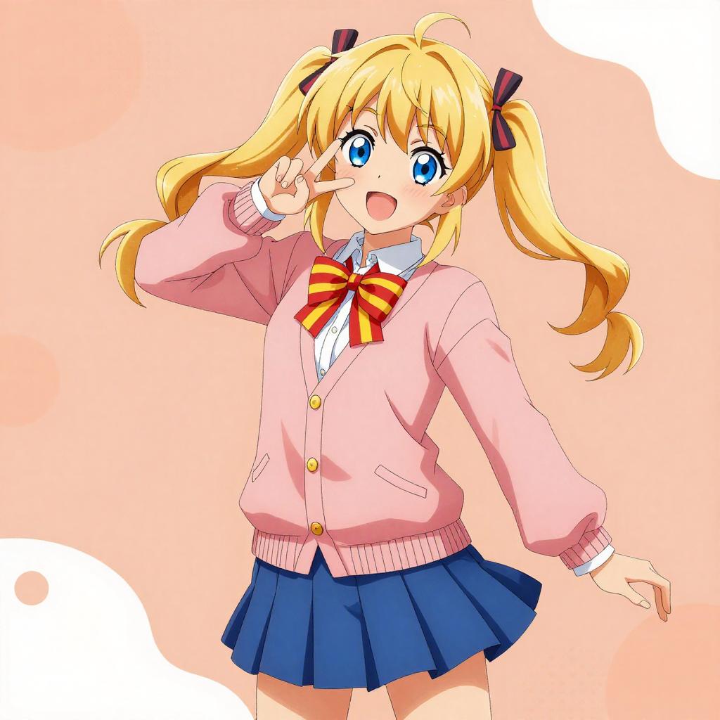 Illustration of a cheerful anime girl with blonde twintails and blue eyes. She is wearing a pink cardigan over a white shirt with a red and yellow striped bow tie, paired with a blue pleated school skirt. The background is peach-colored with abstract shapes and highlights her playful pose.