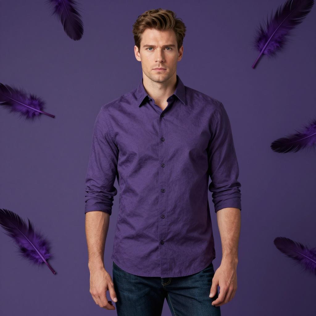 Photorealistic image of a serious-looking man standing front view wearing a purple button-up shirt with rolled-up sleeves and dark blue jeans. The man has short brown hair, fair skin, and a clean-shaven face. He stands confidently against a studio-lit, purple background decorated with purple feathers, showcasing modern casual fashion with realistic details and colors.