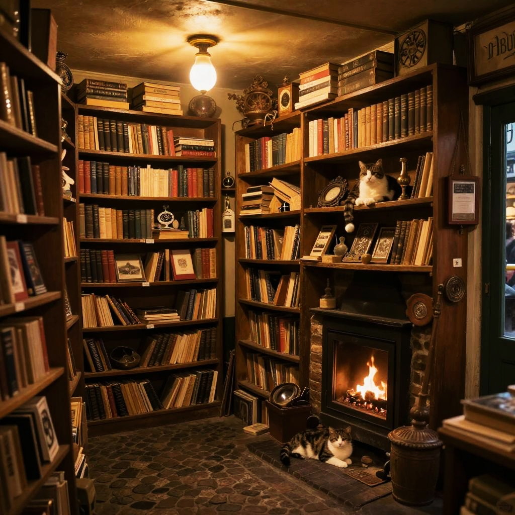 Storef, a cozy, vintage bookstore in a small cobblestone alley, with warm amber lighting, shelves overflowing with old tomes and curious artifacts, a cat lounging near the fireplace, evoking a nostalgic and magical ambiance.