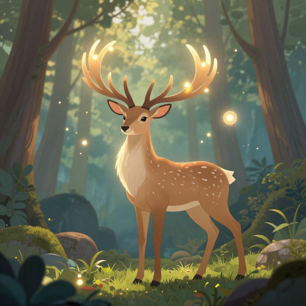Digital illustration of a glowing, antlered deer standing in a sunlit, enchanted forest with glowing fireflies and lush greenery.
