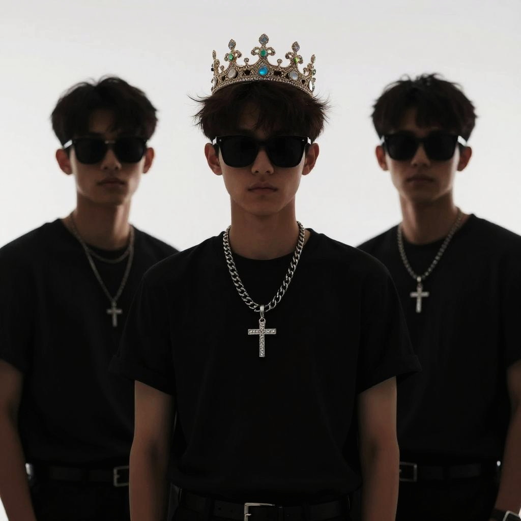 Crown, multiple boys, male focus, 3boys, jewelry, necklace, shadow, silhouette, sunglasses, blurry, short hair, standing, faceless