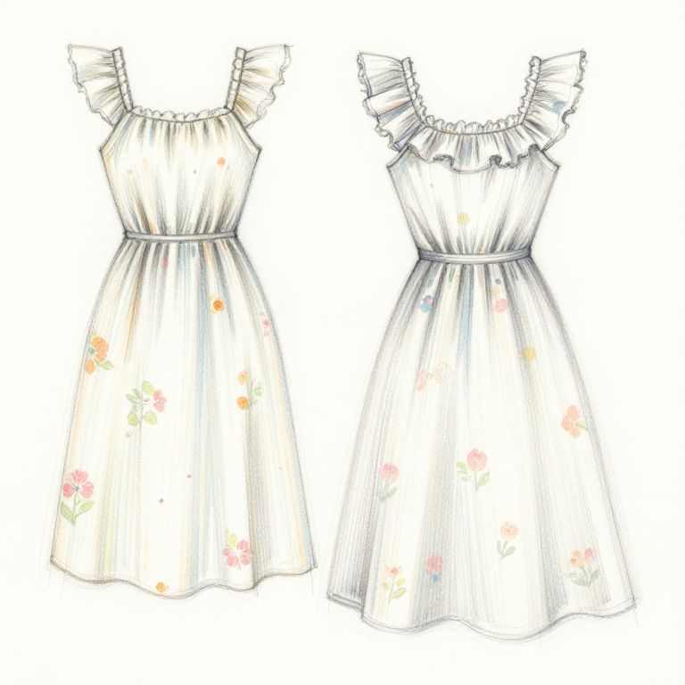 Watercolor sketch of two sleeveless, ruffled, floral summer dresses; one plain, one with ruffles, standing side by side.