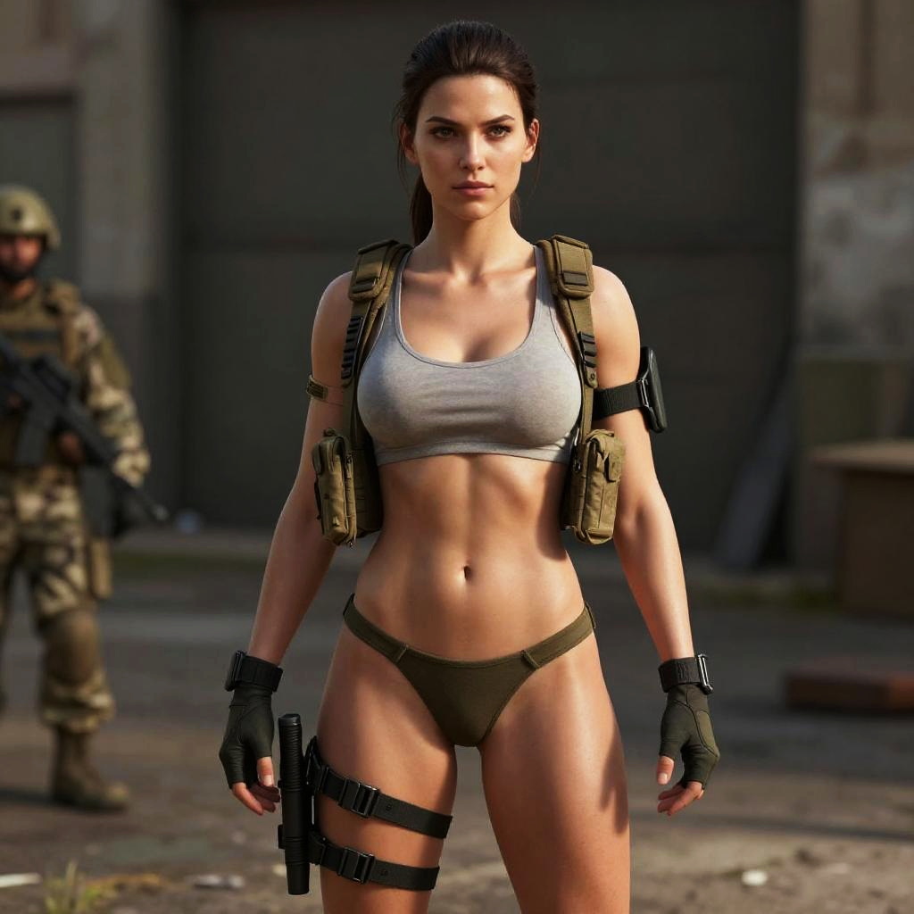 This digital CGI image depicts a muscular, fair-skinned woman with dark brown hair in a ponytail, standing confidently in a gritty, industrial setting. She wears a grey sports bra, black thong, and tactical gear including a backpack, thigh holster, and fingerless gloves, holding a black handgun in her right hand. Her defined abs and strong arms are prominent. In the blurred background, a soldier in camouflage uniform and helmet stands to the left. The scene has a realistic, gritty texture with sunlight casting shadows, and the background includes concrete walls and a large, dark door.