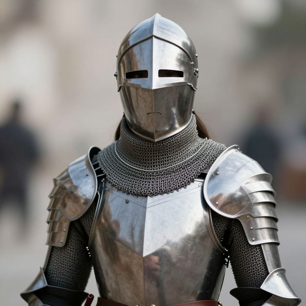 Knight costume female, 1girl, solo, armor, helmet, looking at viewer, breastplate, upper body, plate armor, knight, lips, chainmail, shoulder armor, blurry, pauldrons, blurry background, closed mouth