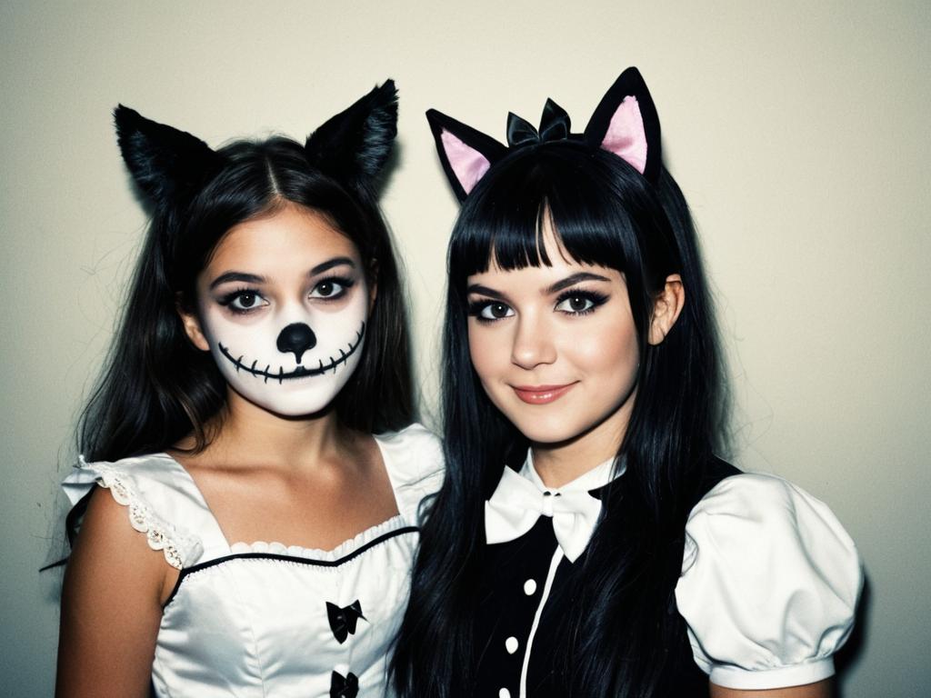 Two young girls dressed in cat-themed costumes featuring black cat ears headbands. One girl has Halloween face paint resembling a skeleton cat with a white and black makeup design. Both girls wear black and white outfits with bows, posing against a plain background.