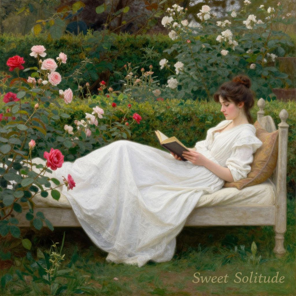 A serene oil painting titled \"Sweet Solitude\" by Edmund Blair Leighton depicts a woman in a flowing white gown reclining on a lush garden bed, surrounded by vibrant roses and manicured hedges, as she engrosses herself in reading a book under the soft, natural light of a tranquil outdoor setting.