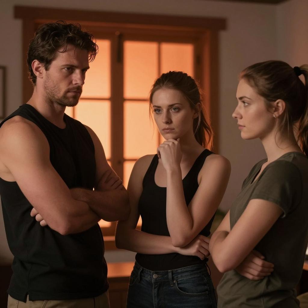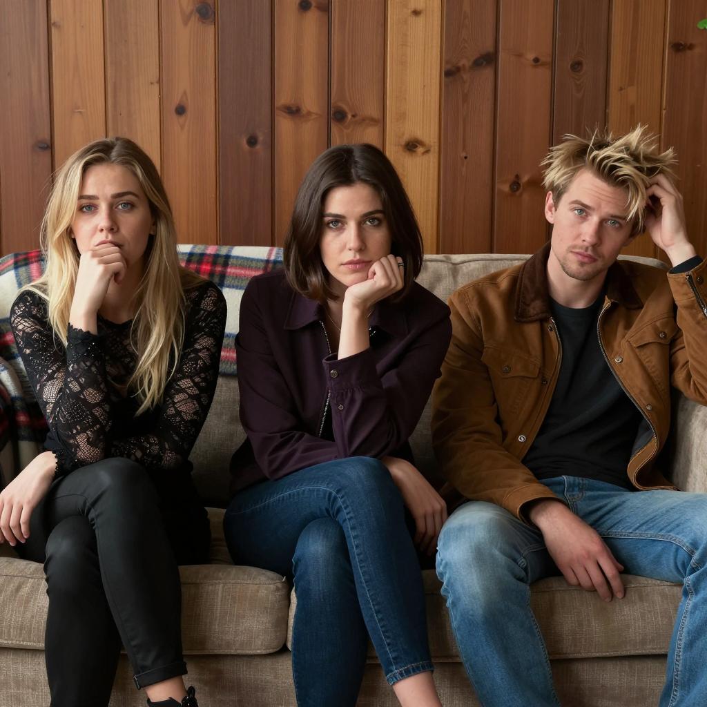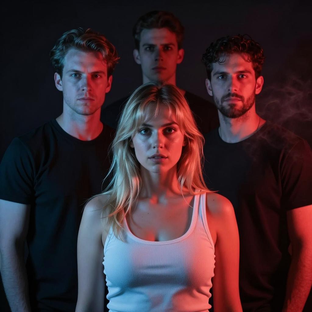 Photograph of four people in low light with blue and red highlights. Front woman with long blonde hair, bangs, white tank top, medium breasts. Three men behind her, intense expressions. Red light on right, smoke effect. Black background.