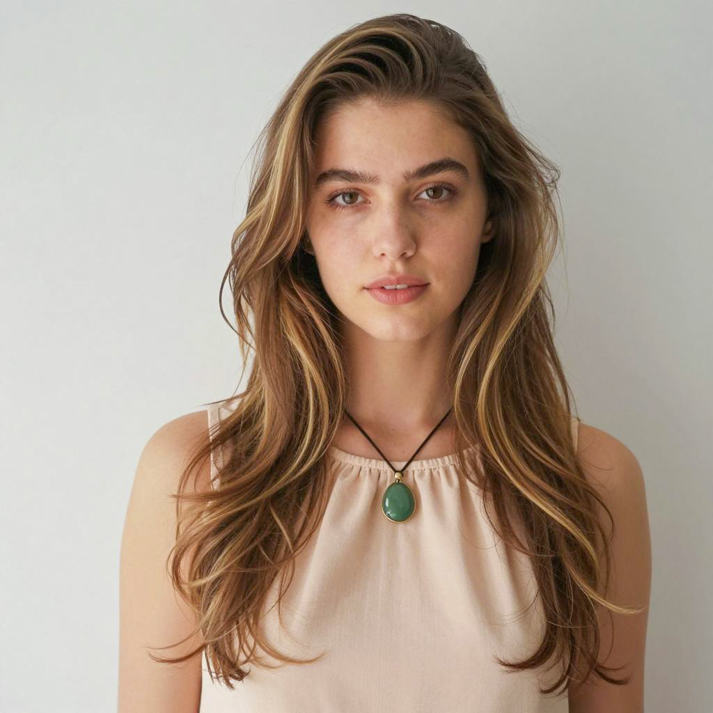 Male long wavy hairstyle, photorealistic portrait of a young woman with long, wavy brown hair with blonde highlights, wearing a sleeveless, light peach blouse, green pendant necklace, neutral expression, soft natural lighting, light gray background, head and shoulders, close-up, realistic ures, modern fashion, subtle makeup, clear skin