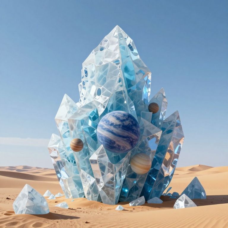 Photorealistic CGI image of a crystal formation in a desert. The towering structure is made of large, translucent, angular blue crystals with a reflective, glass-like surface. Embedded within the crystals are two spherical planets; one resembles Jupiter with its distinctive brown and white stripes, and the other is a smaller, more colorful planet. The background features a clear blue sky and orange sand dunes. Smaller crystal shards are scattered around the base, adding to the intricate, otherworldly scene. The lighting emphasizes the crystals' transparency and the planets' textures.