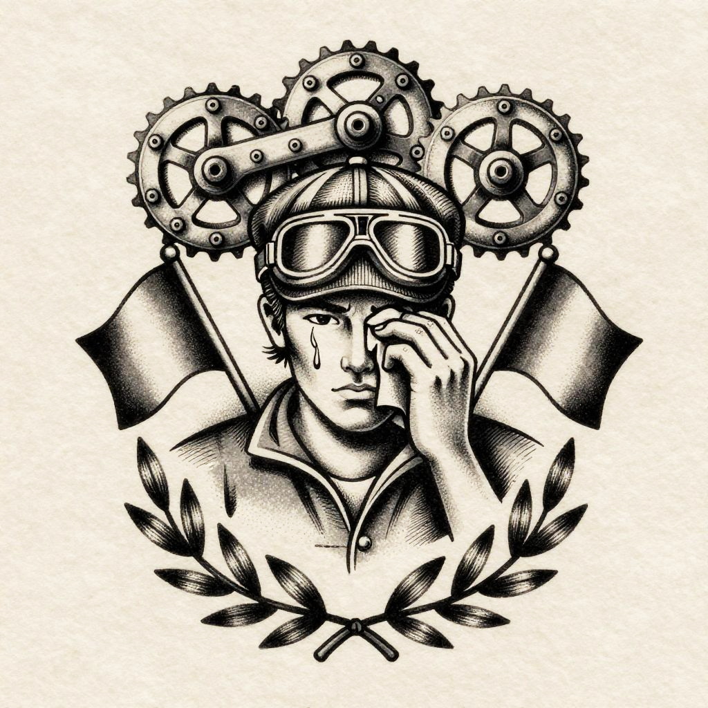 Monochrome ink illustration in a vintage tattoo flash aesthetic featuring cyclist with vintage goggles and flat cap, wiping sweat from brow, framed by bicycle chain and gears above, racing flags flanking, and laurel wreath below. Printed on off-white parchment grain, with crisp linework, stippling and crosshatching, bold negative space, subtle vignette, museum-print finish, high contrast, fine detail, gritty yet elegant mood.