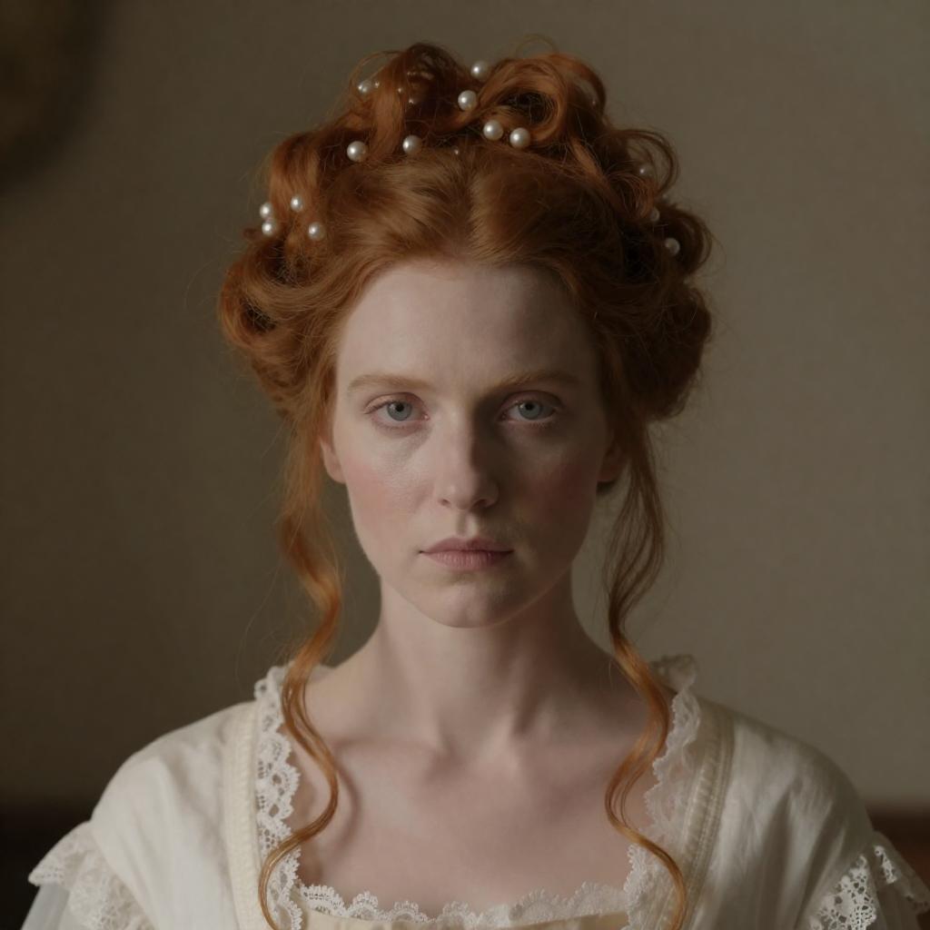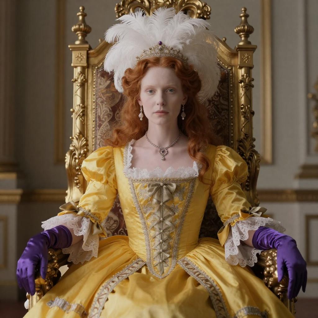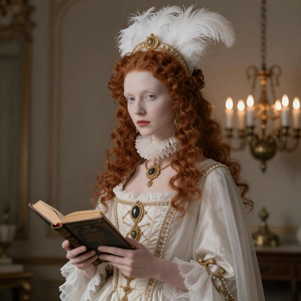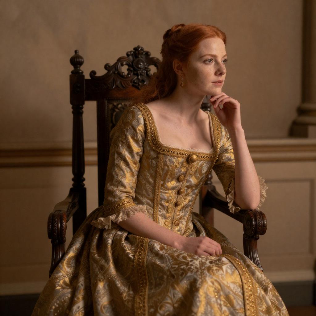 Photograph of a pale-skinned woman with red hair in an elaborate, ornate 17th-century dress. She wears a large, pearl-encrusted ruff and a decorative, jeweled headpiece. Her hands rest on her lap, and she gazes forward with a calm expression. The background is a deep red with a blurred, golden ornate object to the right.