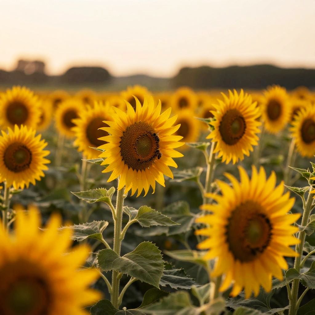 Himawari sunflower garden at sunset, warm golden light casting long shadows, tall green stems bending slightly, bees buzzing around bright yellow flowers, photorealistic style with rich colors and soft focus background showing distant trees