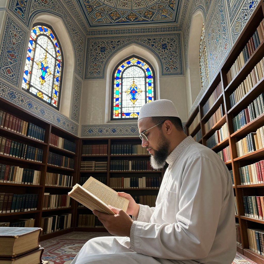 Musulman scholar reading old manuscripts inside a beautifully decorated Islamic library, shelves filled with ancient books, soft daylight streaming through stained glass windows, intricate geometric and floral designs on walls and ceiling, mystical atmosphere.