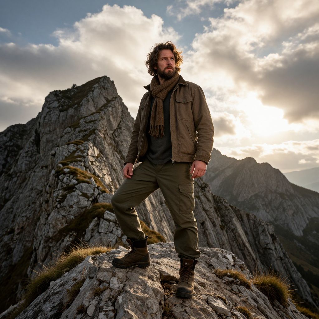A rugged, bearded man with curly brown hair stands confidently on a rocky mountain peak during sunset. He wears a brown jacket, olive pants, a thick brown scarf, and sturdy boots. The background features towering, jagged cliffs with patches of grass, under a dramatic sky with bright clouds. The image has a high-contrast, dramatic lighting style, emphasizing the man's determined expression and the natural setting.