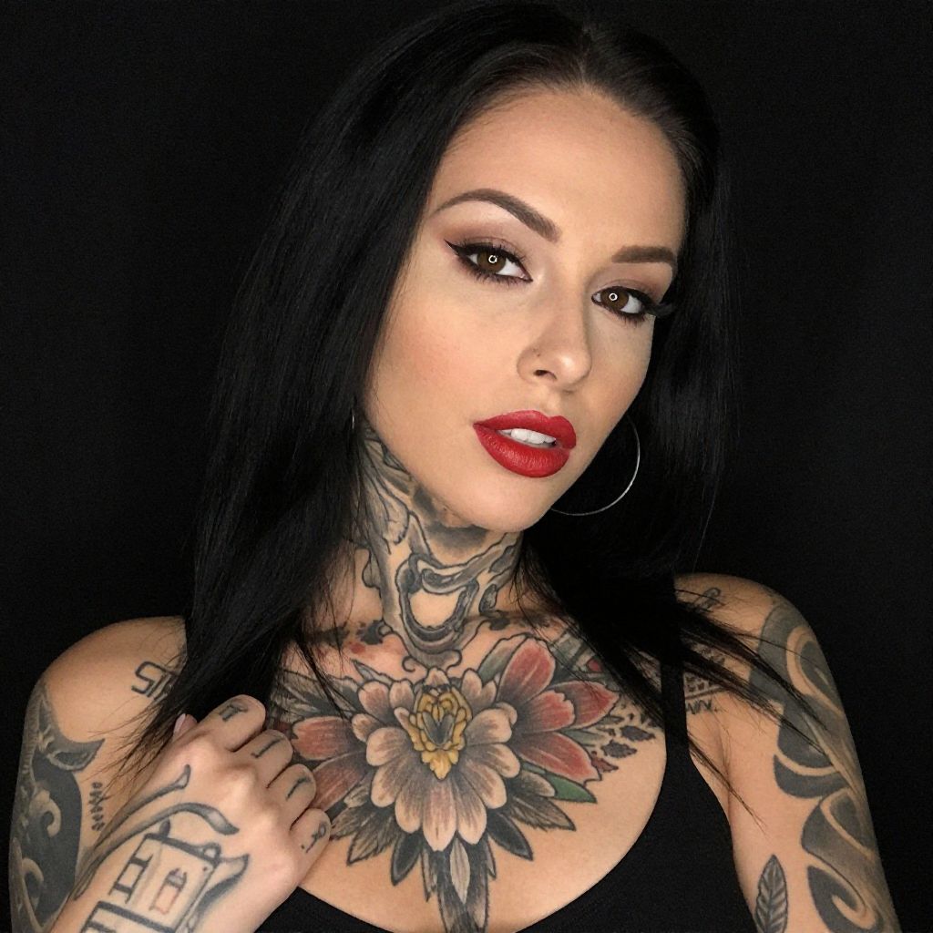 Photograph of a heavily tattooed woman with long black hair, looking directly at the camera with a slightly tilted head. She has bright red lipstick, dark eye makeup, and visible tattoos covering her neck and chest, including a large floral design and text. Her skin is light, and she's wearing a black top, with her right hand touching her chest. The background is solid black.