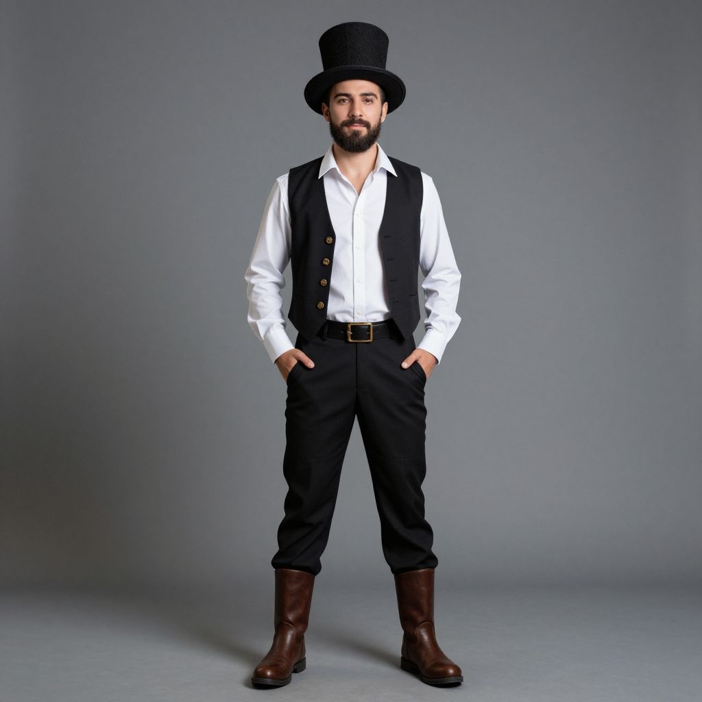 Mordechai costume purim, 1boy, male focus, solo, hat, facial hair, beard, hands in pockets, boots, standing, brown footwear, looking at viewer, full body, vest, pants