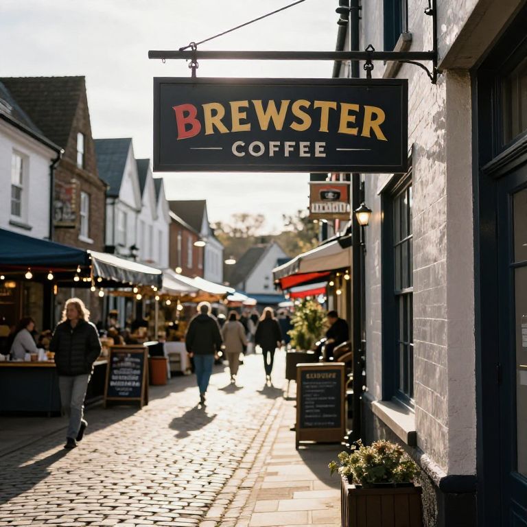 Brewster as an old-fashioned coffee shop sign hanging over cobblestone streets, vibrant hand-painted lettering, bustling market scene in the background, early morning light casting long shadows, nostalgic and cozy atmosphere