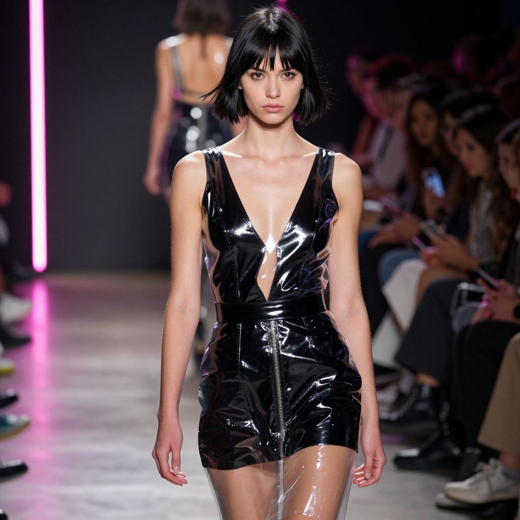 Photograph of a female model walking down a dimly lit runway. She has straight black hair with bangs and wears a tight, sleeveless, black vinyl mini dress with a deep V-neck and a zipper down the front. Her skin is fair, and she has a slender, toned physique. The background is blurred but shows seated audience members and another model in a similar dress. Vertical neon pink lights are visible on the left. The runway is illuminated, highlighting the glossy texture of her dress. The overall style is modern and edgy.