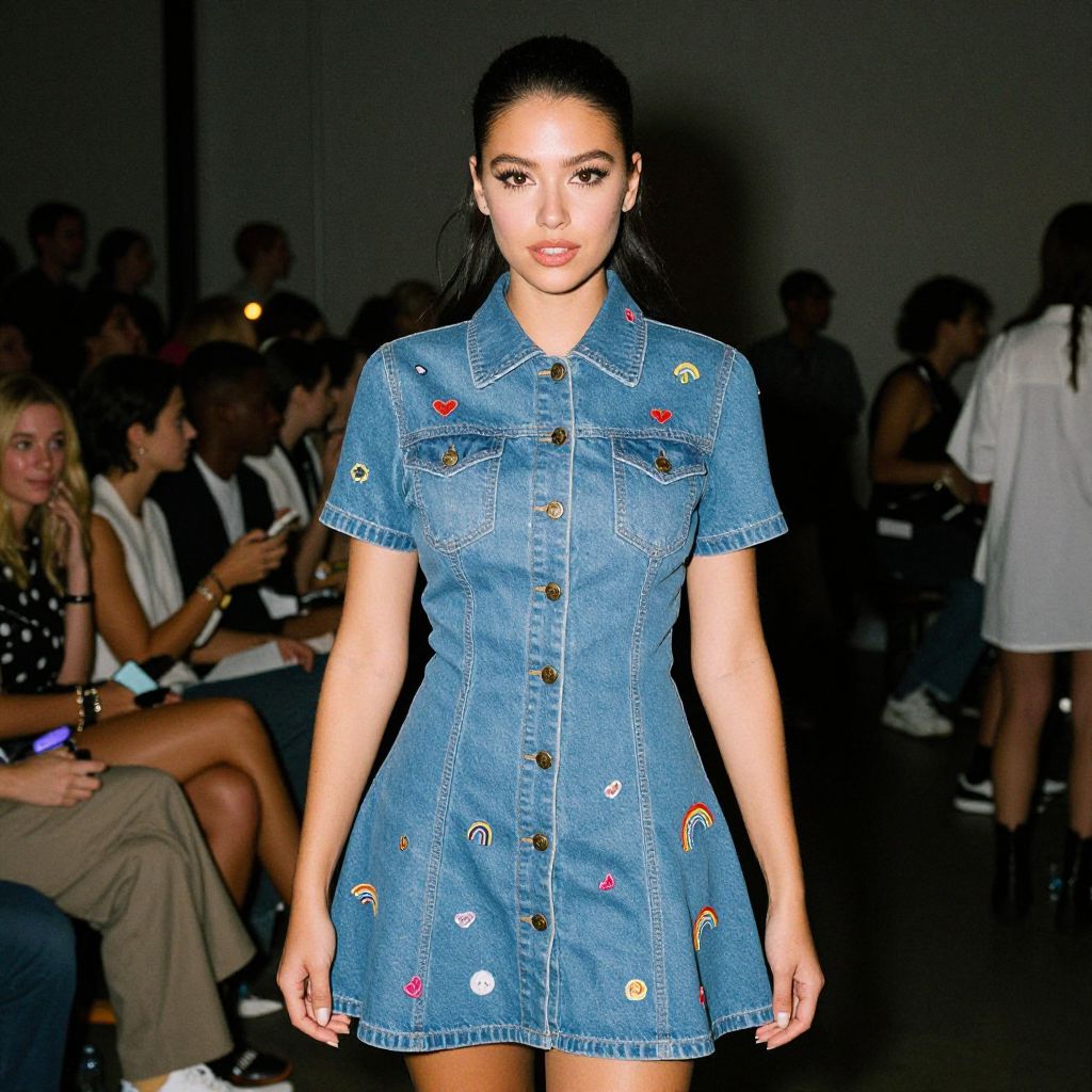 Photograph of a young woman with long, dark hair pulled back, walking down a fashion runway. She wears a short-sleeved, button-up denim dress adorned with colorful embroidered patches on the chest, pockets, and skirt. Her skin is tan, and she has a focused expression. The background is dimly lit, with an audience seated on both sides, some holding phones. The audience members are dressed casually, with some in polka dot and patterned tops. The overall mood is trendy and modern, with the runway lights highlighting the model's dress.