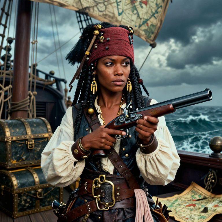 Portrait of a black female pirate with intricate braids and gold earrings, holding a vintage flintlock pistol, aboard an ancient pirate ship, surrounded by treasure chests, exotic maps, and a stormy sea background, vibrant colors and dynamic lighting.