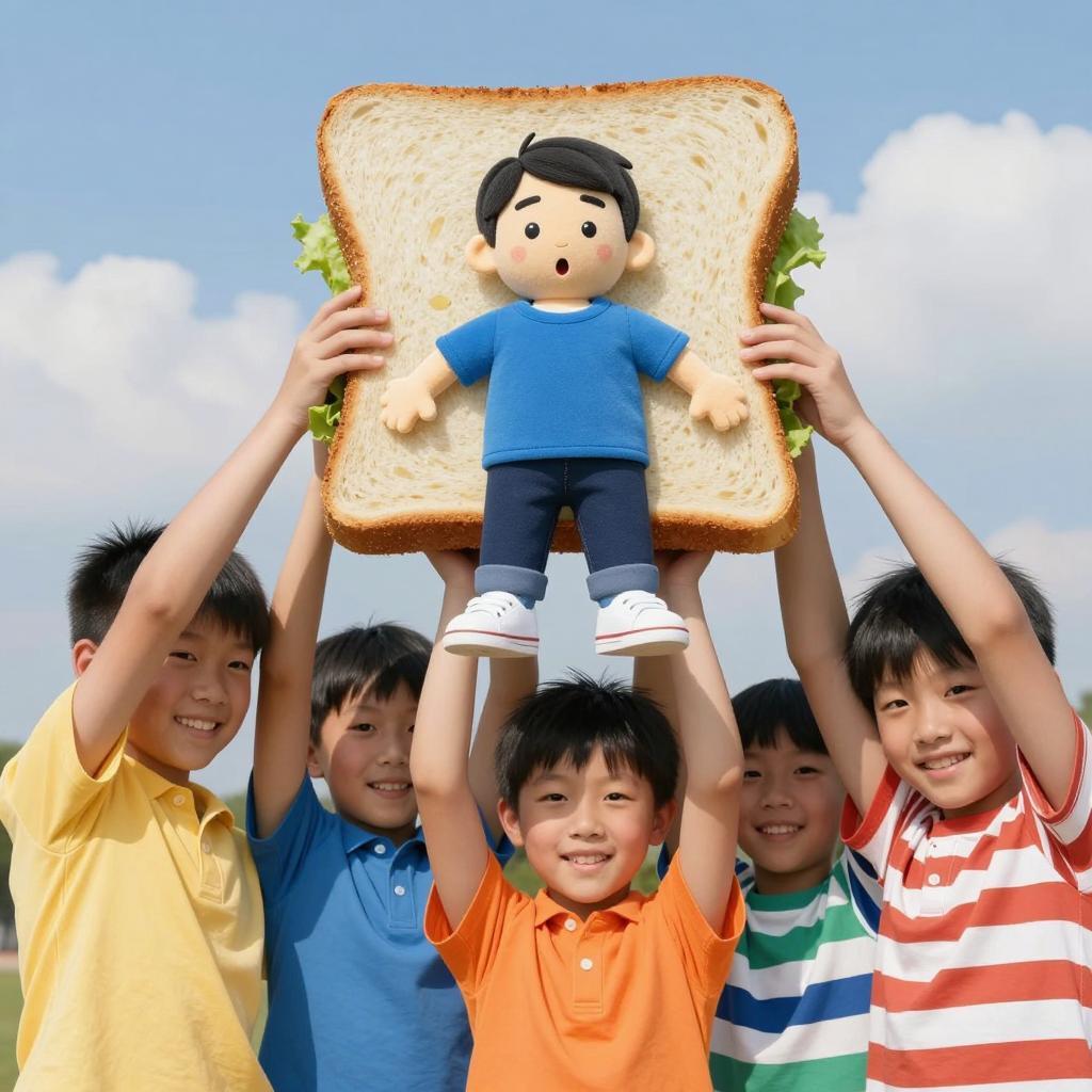 Photograph of five smiling Asian boys outdoors holding a giant sandwich above their heads. The sandwich contains a cartoon-like figure of a man wearing a blue shirt, dark jeans, and white sneakers with a surprised facial expression. The children wear colorful polo shirts in yellow, blue, orange, green-white-blue stripes, and orange-white stripes. The background shows a blue sky with scattered white clouds.