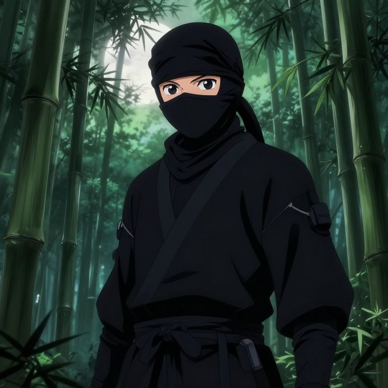 Animeoline.ninja stealthy ninja character in traditional black outfit blending into a bamboo forest, moonlight filtering through leaves, detailed anime art style with expressive eyes and intricate ninja gear
