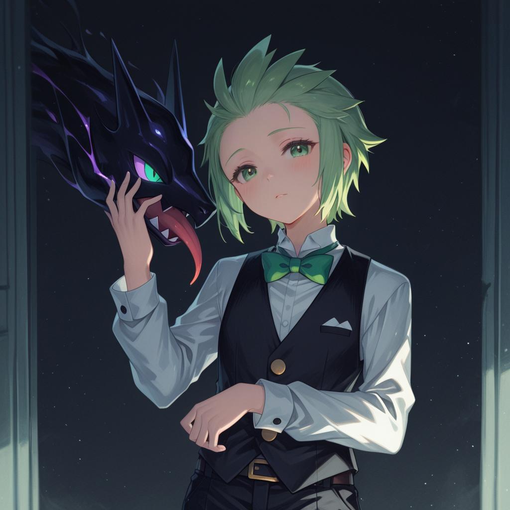 Digital artwork of an anime-style boy with short green hair and green eyes, wearing a white long-sleeve shirt, black vest, black pants, and a green bowtie. The boy holds a dark, stylized dragon head mask with glowing purple accents and a protruding red tongue, set against a dark background with subtle stars.