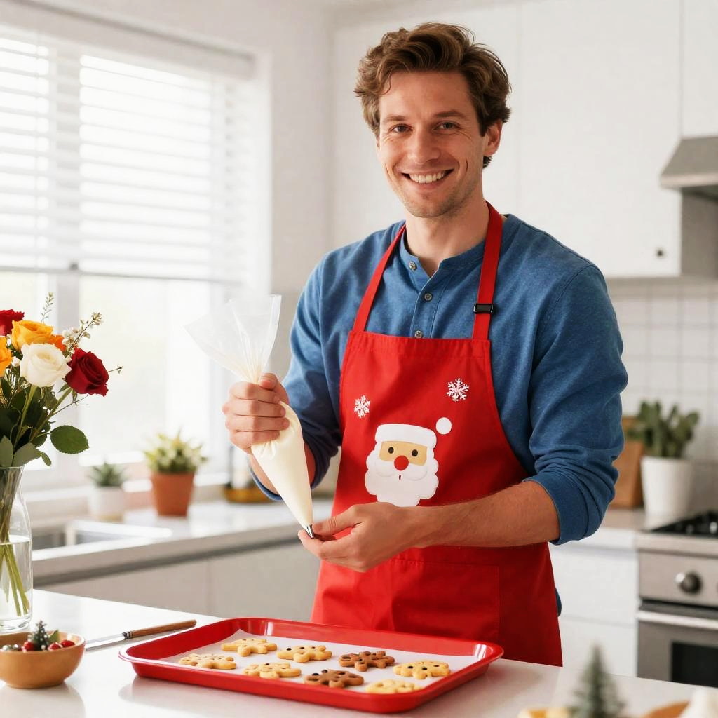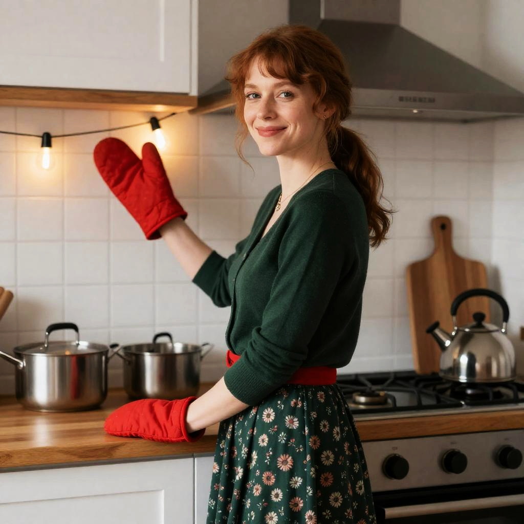 Blonde woman in green and white patterned sweater, standing in kitchen, cutting a small doll with red polka dot dress. Kitchen counter with bouquet of white flowers, ceramic mug, knife block, black candle holder. Wooden cabinets in background. Woman focused, cutting with knife. Bright kitchen lighting.