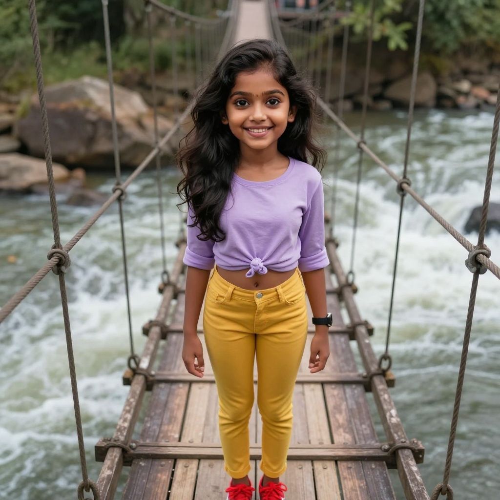 Photograph of a young Indian girl with long, wavy black hair and dark brown eyes, standing on a wooden suspension bridge over a fast-flowing river. She has a bright smile, wearing a light purple, tied-up long-sleeve shirt, high-waisted yellow pants, and red sneakers. The bridge's ropes frame her, with lush greenery and rocks visible in the background. The river's white, turbulent water contrasts with the wooden bridge and her vibrant clothing. She wears a black wristwatch on her left wrist. The image has a slightly exaggerated, vibrant color style, making the scene visually striking.