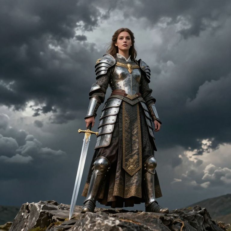 Photograph of a determined, light-skinned woman with long brown hair, standing on a rocky outcrop under a dramatic, cloudy sky. She wears full medieval silver armor with intricate gold detailing on the chest and waist, and black leather beneath. Her right hand grips a gleaming, silver sword with a gold hilt, planted in the rock beside her. Her expression is fierce and resolute. The rocky foreground contrasts with the dark, swirling clouds in the background, adding a sense of urgency and drama to the scene. The image is highly detailed, emphasizing textures of metal and fabric.