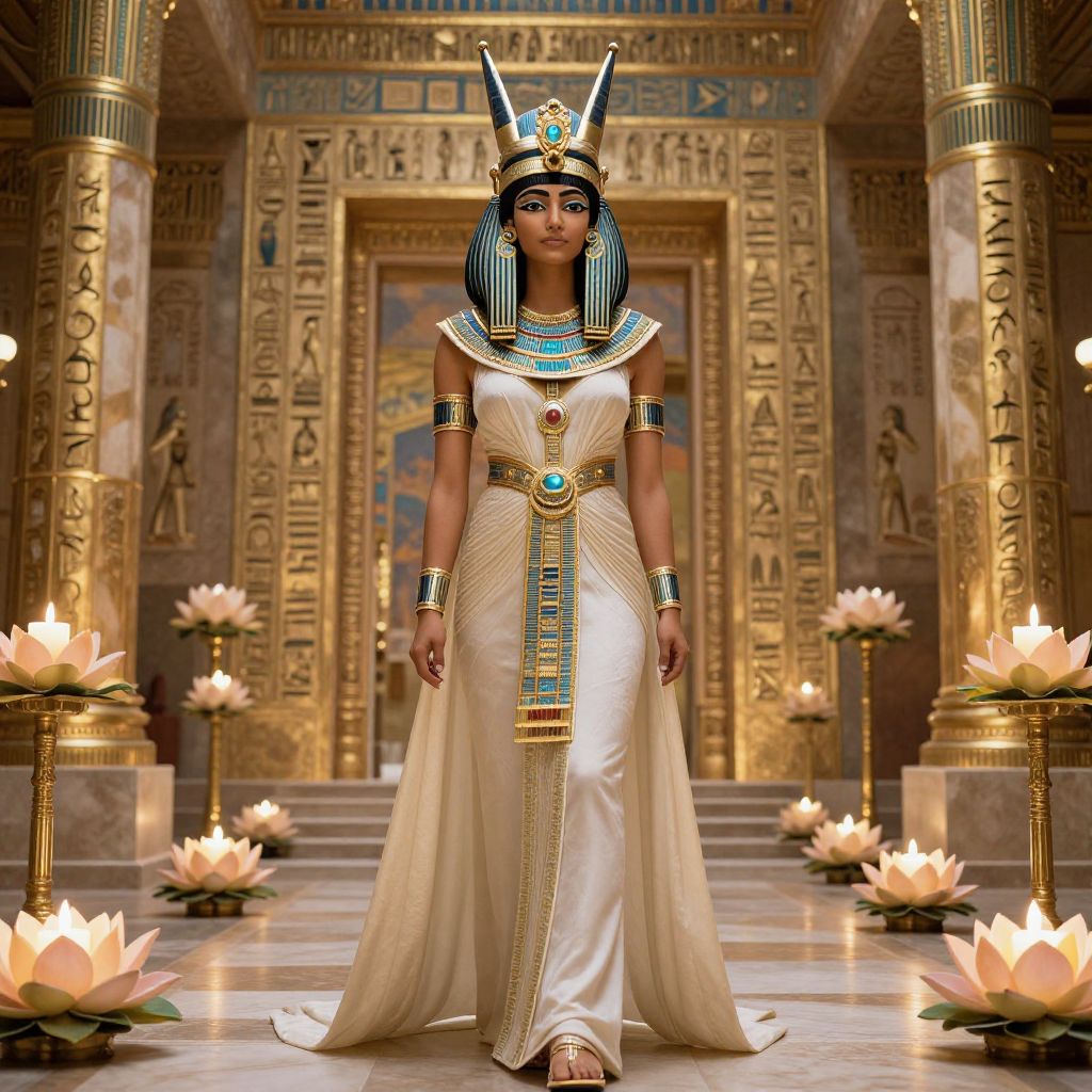 Cleo, an elegant ancient Egyptian queen standing in a grand palace adorned with golden hieroglyphs, wearing a jewel-encrusted headdress and flowing royal robes, surrounded by glowing candles and lotus flowers, highly detailed, vibrant colors