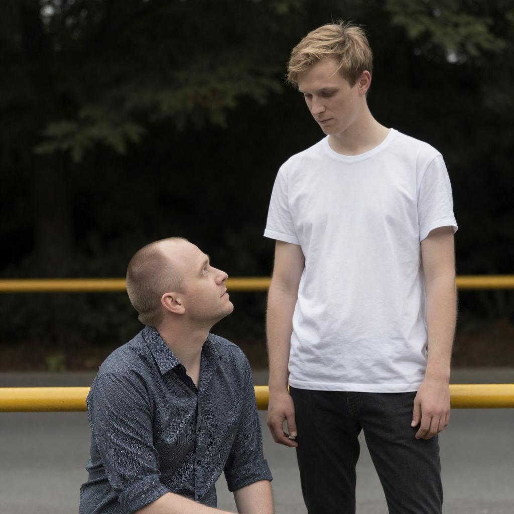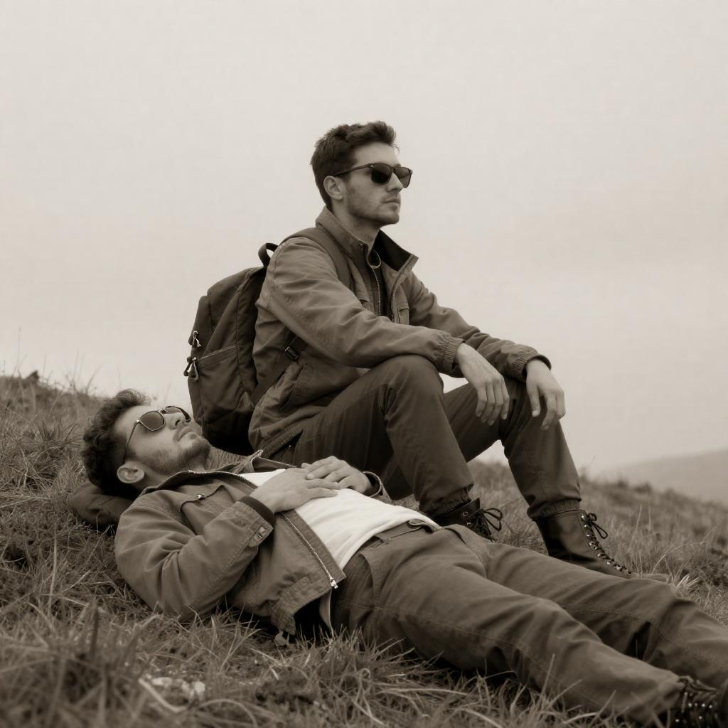 Two men lying face down in the snow. Both wear blue jeans and jackets, one in beige, one in black. Snow-covered ground, snow kicked up around them. Right edge has string of colorful lights. Overcast lighting.
