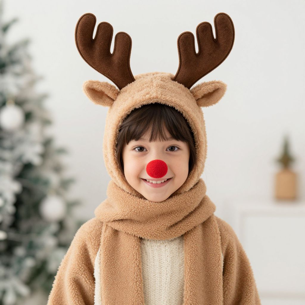 Reindeer Costume Girl, wearing a reindeer hat and scarf with a red nose