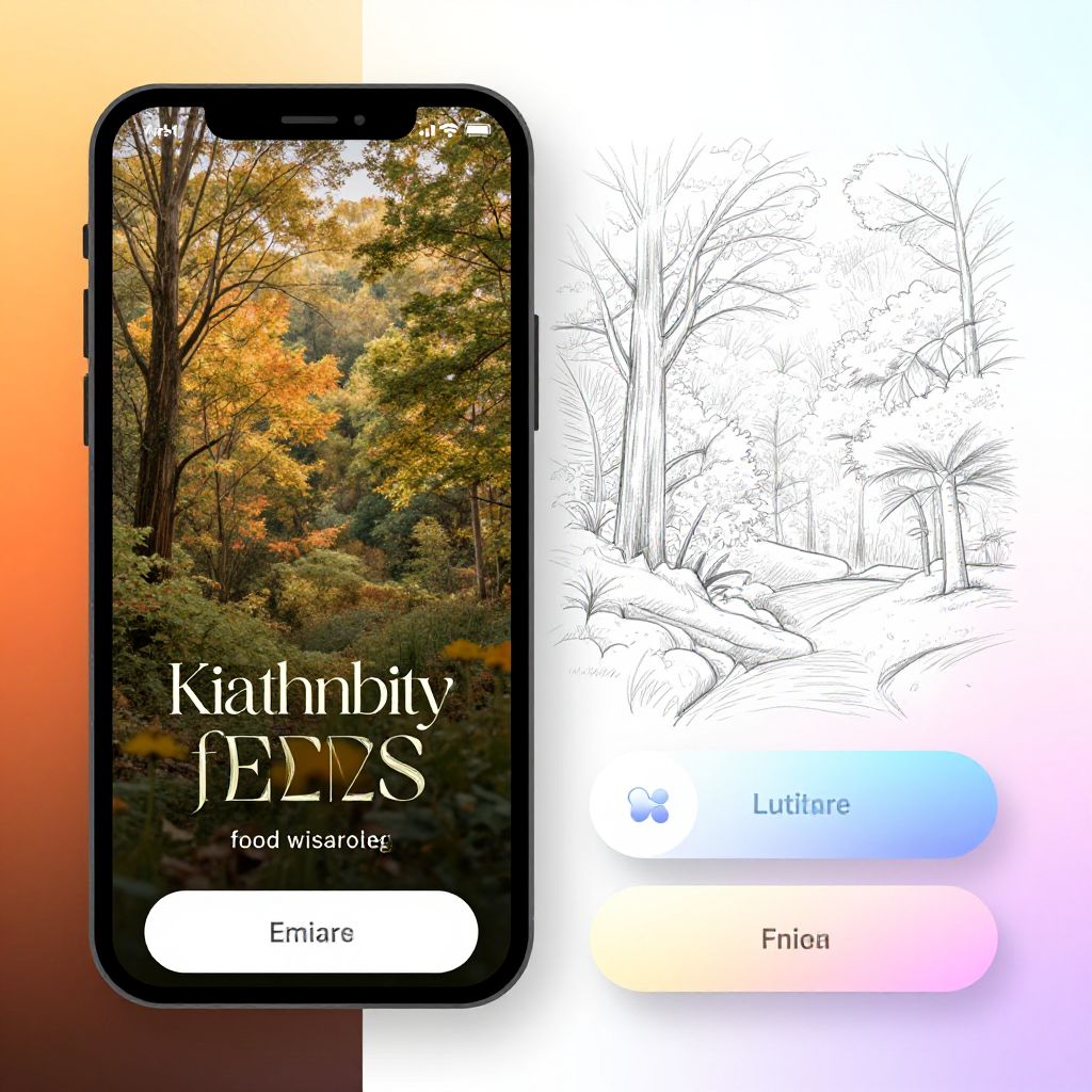 Turn photo into sketch app promotional poster, blending a vibrant nature photo with a finely detailed sketch overlay, featuring app name in elegant fonts, buttons showcasing different sketch styles, smooth gradients, artistic and technological fusion, inviting interface mockup.