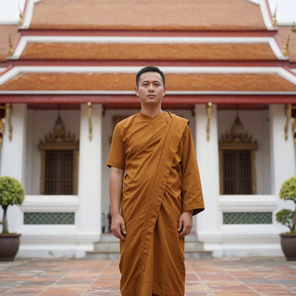 Thailand Costume Simple, man in brown robe standing in front of a building