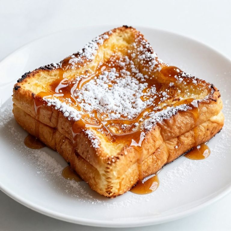 Golden challah french toast slices, dusted with powdered sugar and drizzled with syrup, rest invitingly on a white plate, showcasing their fluffy texture and caramelized edges.