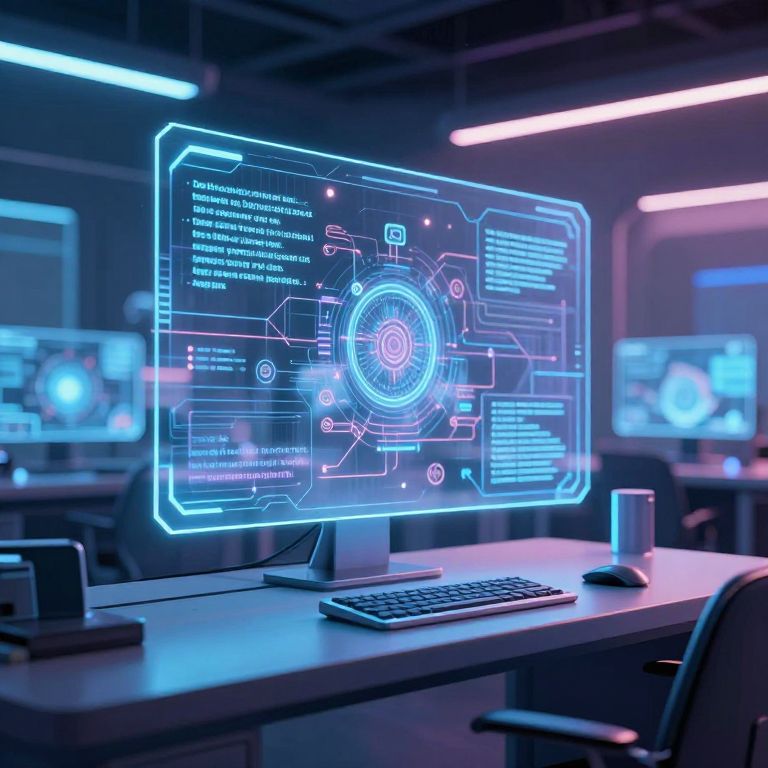 Photograph of a futuristic, glowing blue interface on a computer monitor in a dimly lit, modern workspace with neon lighting.