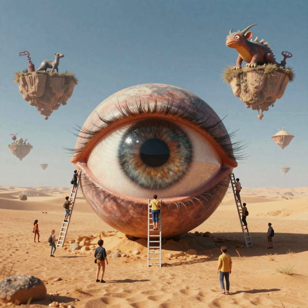Surrealism ideas generator depicting a giant eye opening in the center of a desert, with tiny humans climbing ladders to reach it, surrounded by floating islands and bizarre creatures, rendered with rich colors and a surreal, mystical atmosphere.