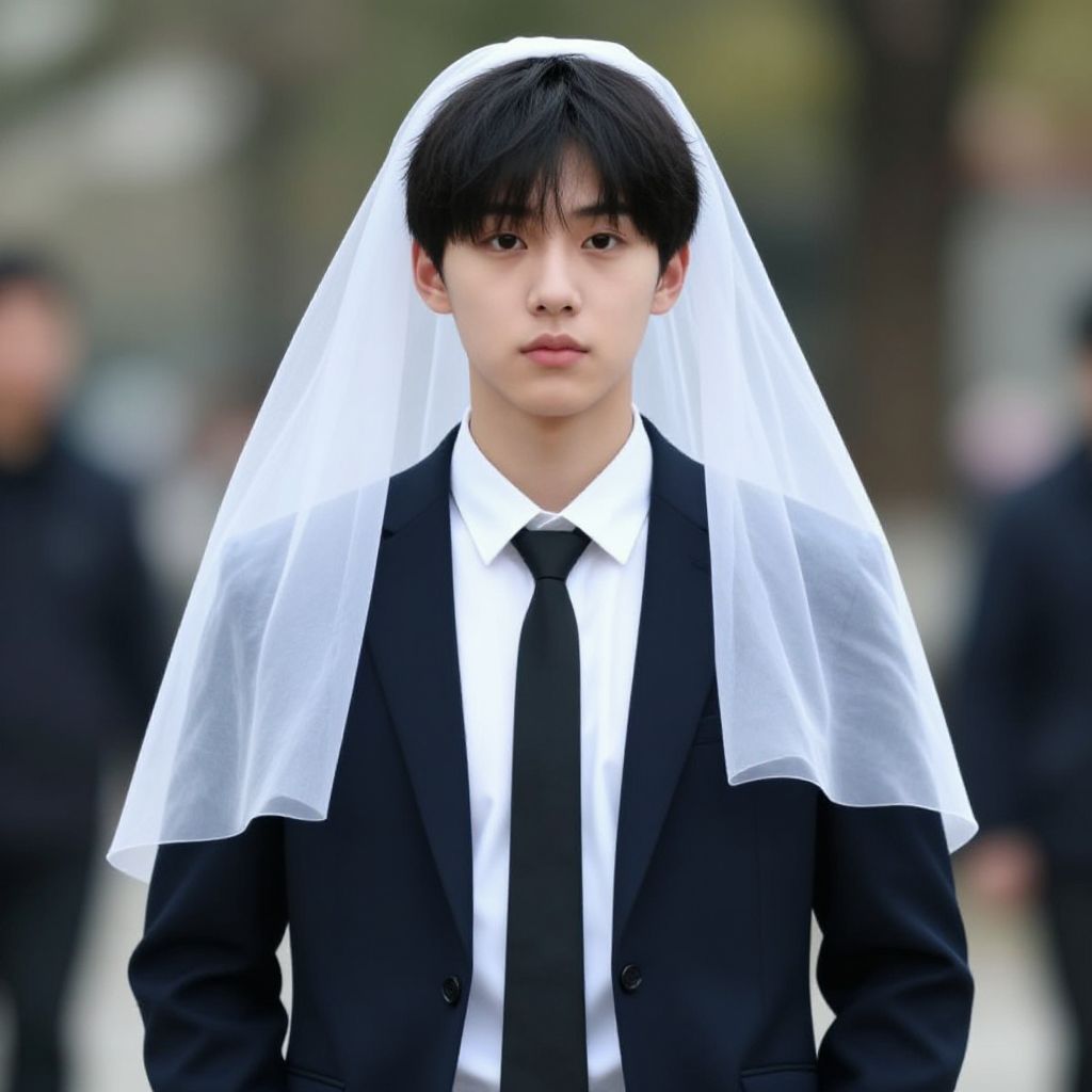 Photograph of a young East Asian man standing outdoors, wearing a black suit with a white dress shirt and black tie. He has straight, black hair and is adorned with a traditional white wedding veil. His expression is neutral, with slightly parted lips and a direct gaze. The background is blurred, showing indistinct figures and greenery, suggesting an outdoor setting. The image has a sharp focus on the man, highlighting the contrast between the white veil and black suit. The overall tone is formal and slightly solemn.