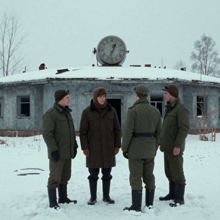 Photograph of four men standing in snowy landscape in front of a dilapidated, gray, rectangular building with a large, round clock on the roof. The men wear dark green military-style winter coats, black boots, and brown beanies or caps. The central man, with a brown beanie, stands slightly apart from the others, who face him. The building has broken windows and a snow-covered roof. Bare trees are visible in the background. The overall scene has a cold, wartime atmosphere. The image has a slightly desaturated, gritty quality, enhancing the bleak, historical feel.