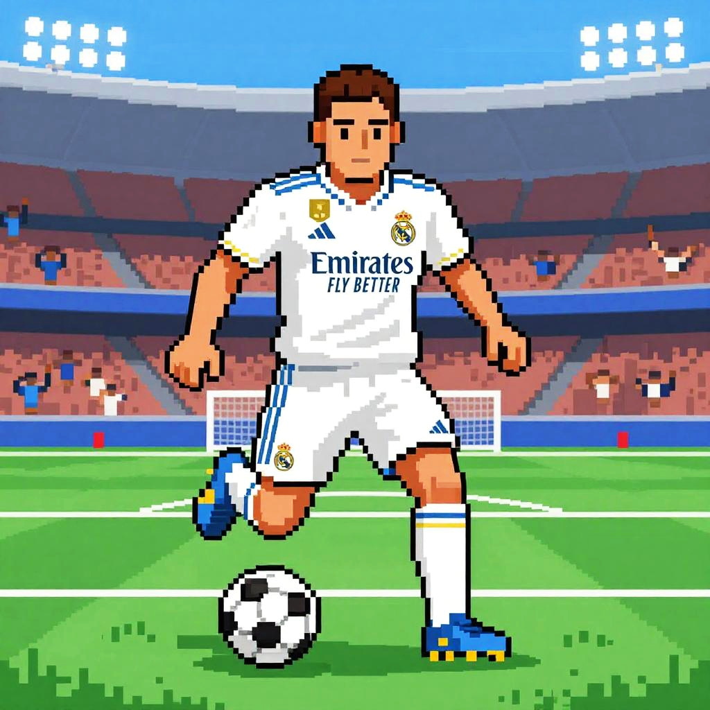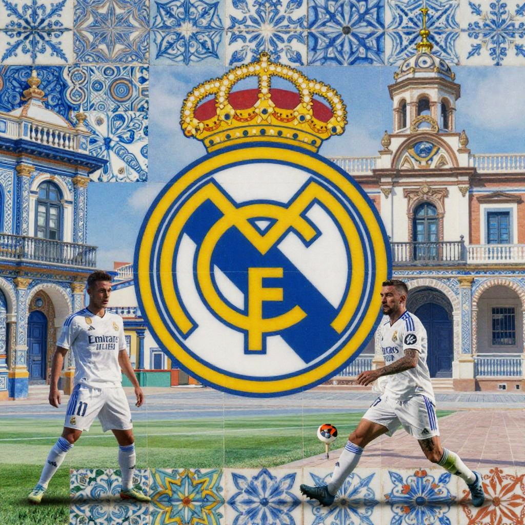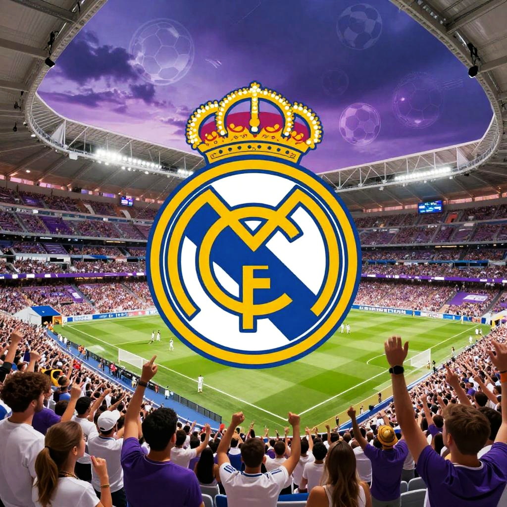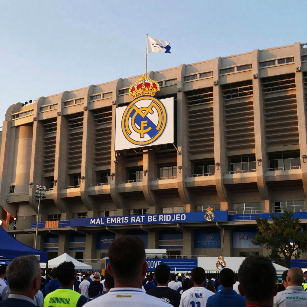 A Real Madrid background showcasing the iconic Santiago Bernabéu stadium bathed in evening golden light, with detailed architecture, waving flags, and a soft-focus crowd, evoking energy and passion in a photorealistic style.
