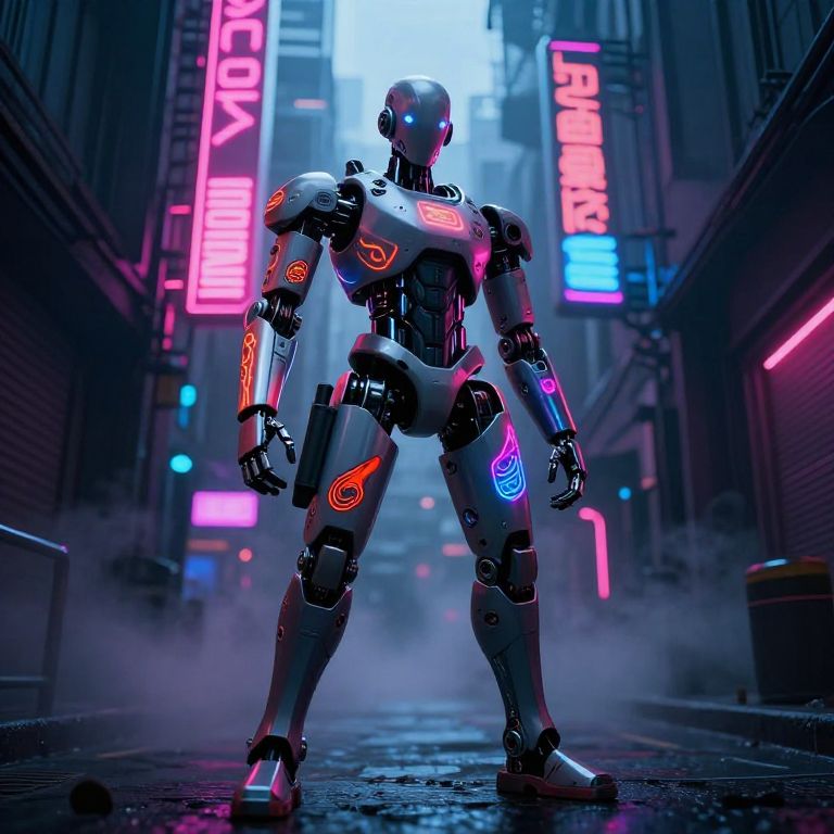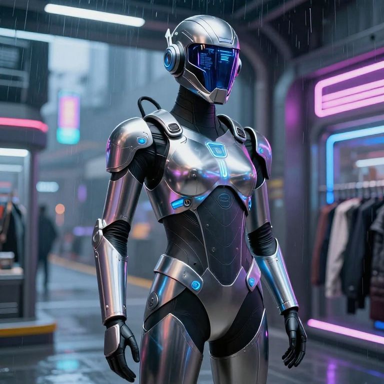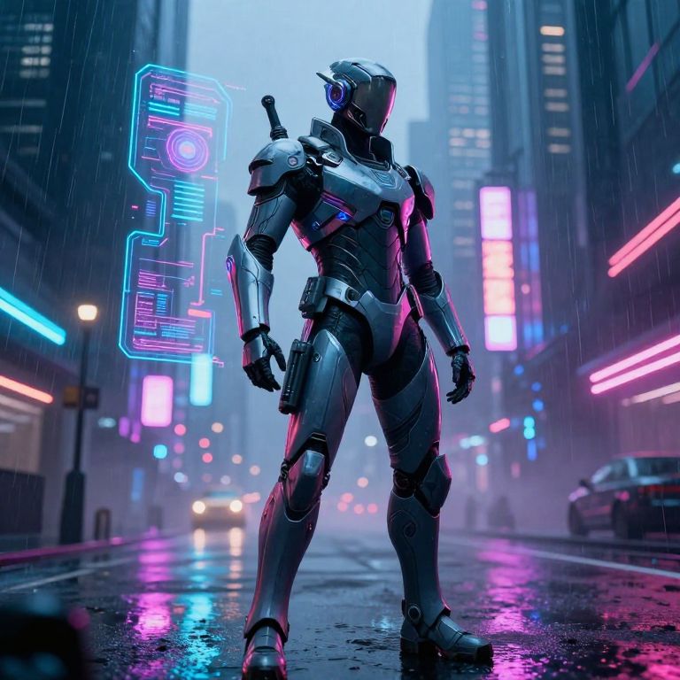 Scifi bodysuit with robotic enhancements and glowing circuits, urban night scene with rain reflections, neon pink and cyan accents, strong dramatic lighting, action-ready stance