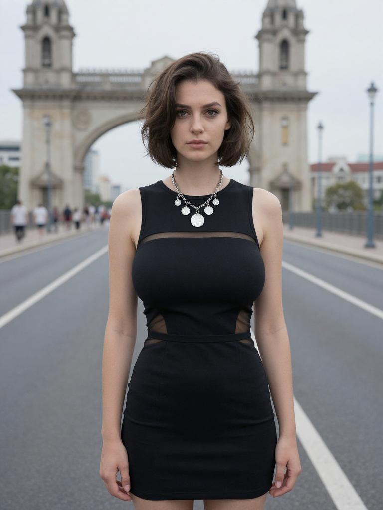 A slim woman in a minimalist, sleeveless little black dress with sheer paneling stands by a historic bridge, wearing a statement silver necklace and sporting a casual tousled hairstyle. Visual style: Holga camera. Sexy. Pretty face and beаutiful eyes. Big breasts
