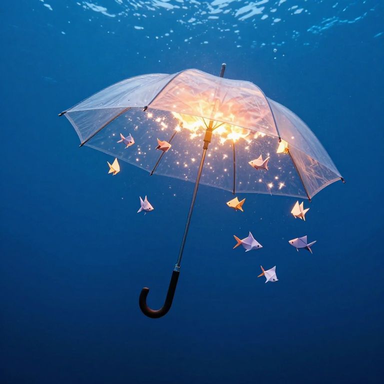 Under the serene depths of the ocean, an umbrella blooms like a celestial flower, casting a radiant glow over origami fish that dance through liquid stardust, symbolizing the delicate balance between hope and wonder in the vast expanse of the unknown.