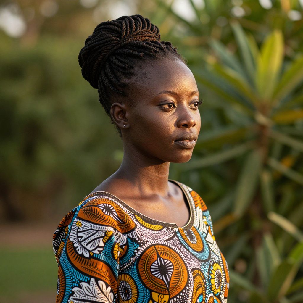 Photograph of a dark-skinned African woman with braided hair, wearing a vibrant, patterned dress, standing outdoors with greenery in the background