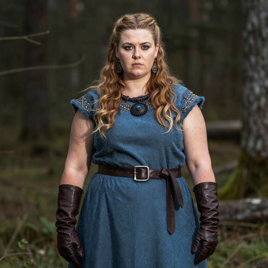 Plus Size Viking Woman, woman in a blue dress and brown leather gloves standing in a forest