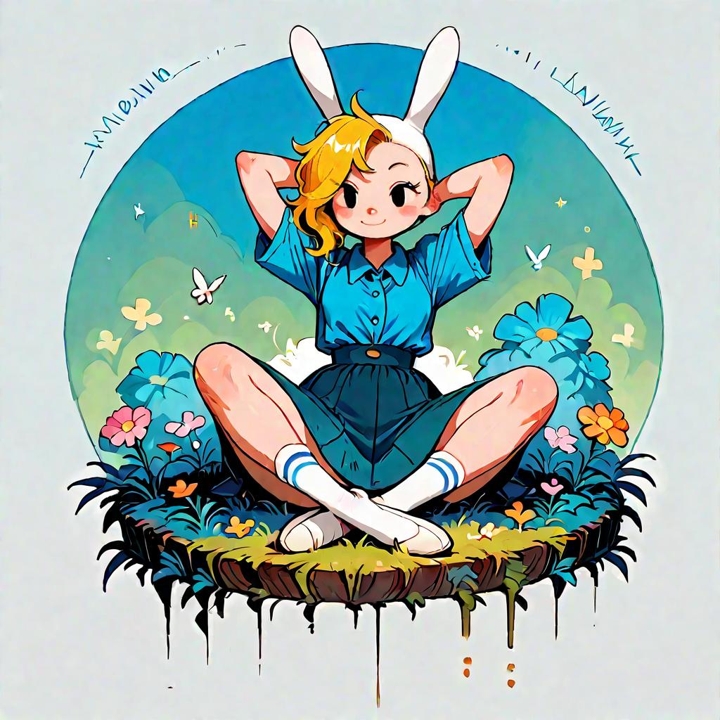 Digital drawing of a blonde girl with bunny ears, sitting cross-legged on grassy island, wearing blue shirt and skirt, white socks, surrounded by flowers