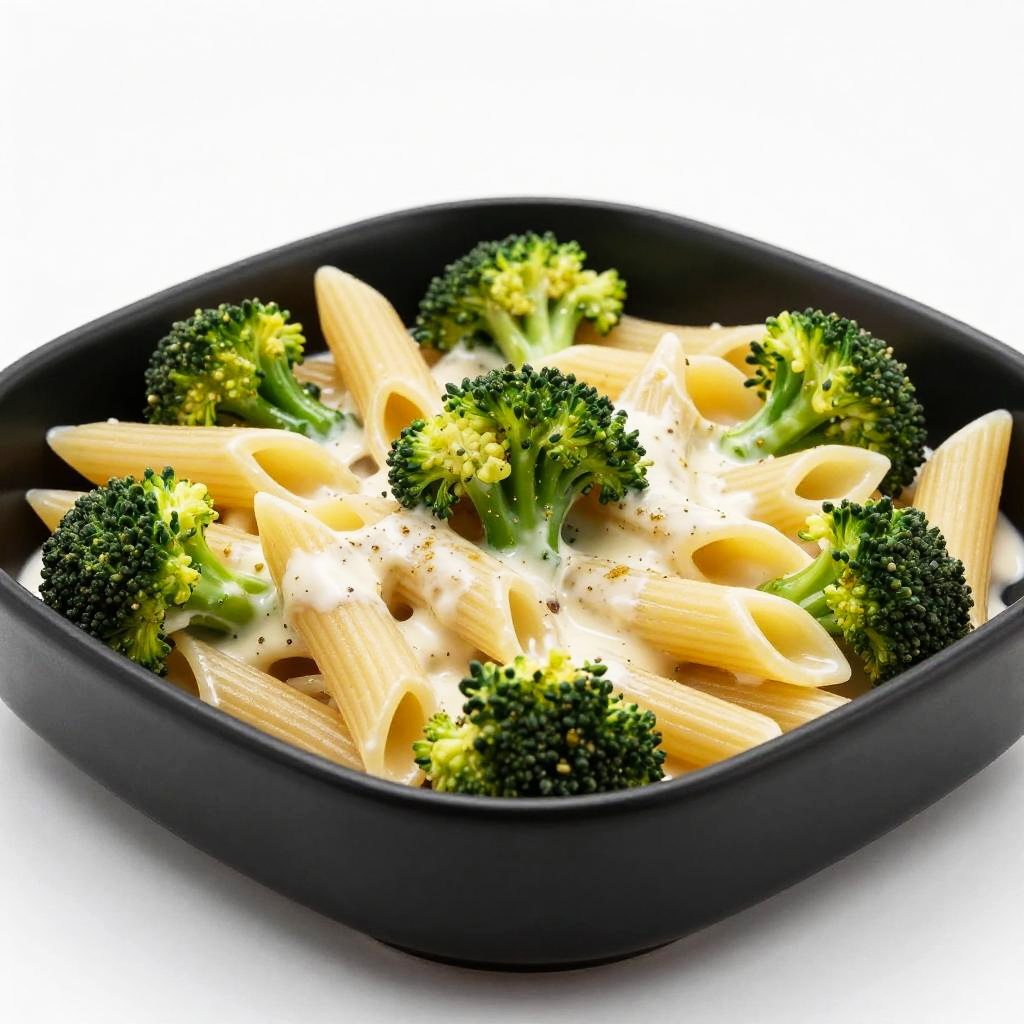 A close-up photo of penne pasta in a glossy black, rectangular dish. The pasta is tossed with bright green broccoli florets and topped with a creamy, white sauce that's lightly peppered. The dish is centered against a plain white background, making the colors pop. The pasta looks freshly cooked and the sauce has a slightly glossy texture.
