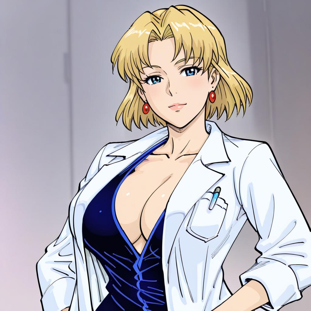 Akagi ritsuko, neon genesis evangelion, 1girl, green eyes, mole under eye, short hair, blonde hair, large breasts, medium breasts, lab coat, earrings, lipstick, by artist lindaroze, illustrious