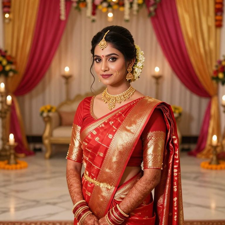A stunning Indian bride with a warm, glowing complexion and soft brown eyes is styling her hair into a luxurious bridal bun, adorned with delicate gold accessories. She wears a traditional red and gold saree with intricate woven patterns, flowing gracefully over her body in a grand wedding hall lit by soft candlelight and floral decorations. The setting is a traditional Indian wedding venue with marble floors, a marigold-scented atmosphere, and vibrant silk drapes in the background.